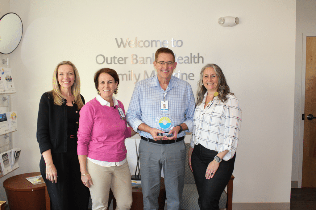 Pictured, left to right: Lynne Miles, executive director, medical group operations; Jennifer Allen, director, medical group operations; Ray; Stephanie Huband, practice manager, Outer Banks Health Family Medicine – Kitty Hawk